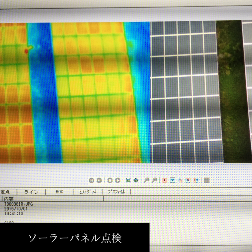 弊社のドローンで約60m上空から検査が可能で高速で且つ自動航行にて検査を行いますが異常パネルの限定がネックで成果物の可否ご今後この分野の鍵ではあります。この辺をクリアすれば圧倒的な速さで点検業務が可能になります。また小型の赤外線カメラ搭載ドローンも保有しており一般家庭の屋根ソーラーには十分判定できるスペックです。弊社は大型・中型・小型とニーズに合った赤外線カメラ搭載のドローンを所有しております。