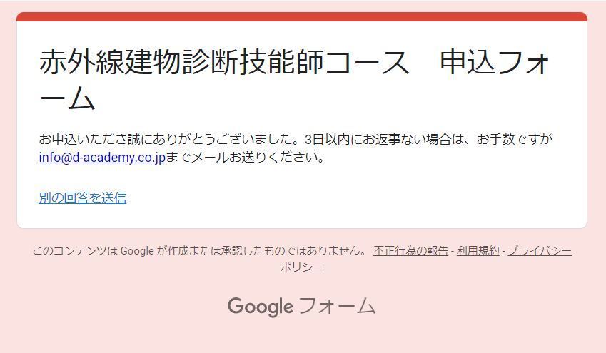 Googleフォームにてお申込後、「お申込いただき誠にありがとうございました」という画面が出てきます。出ない場合はエラーで申し込みが完了しておりません。最後までご記入ください。