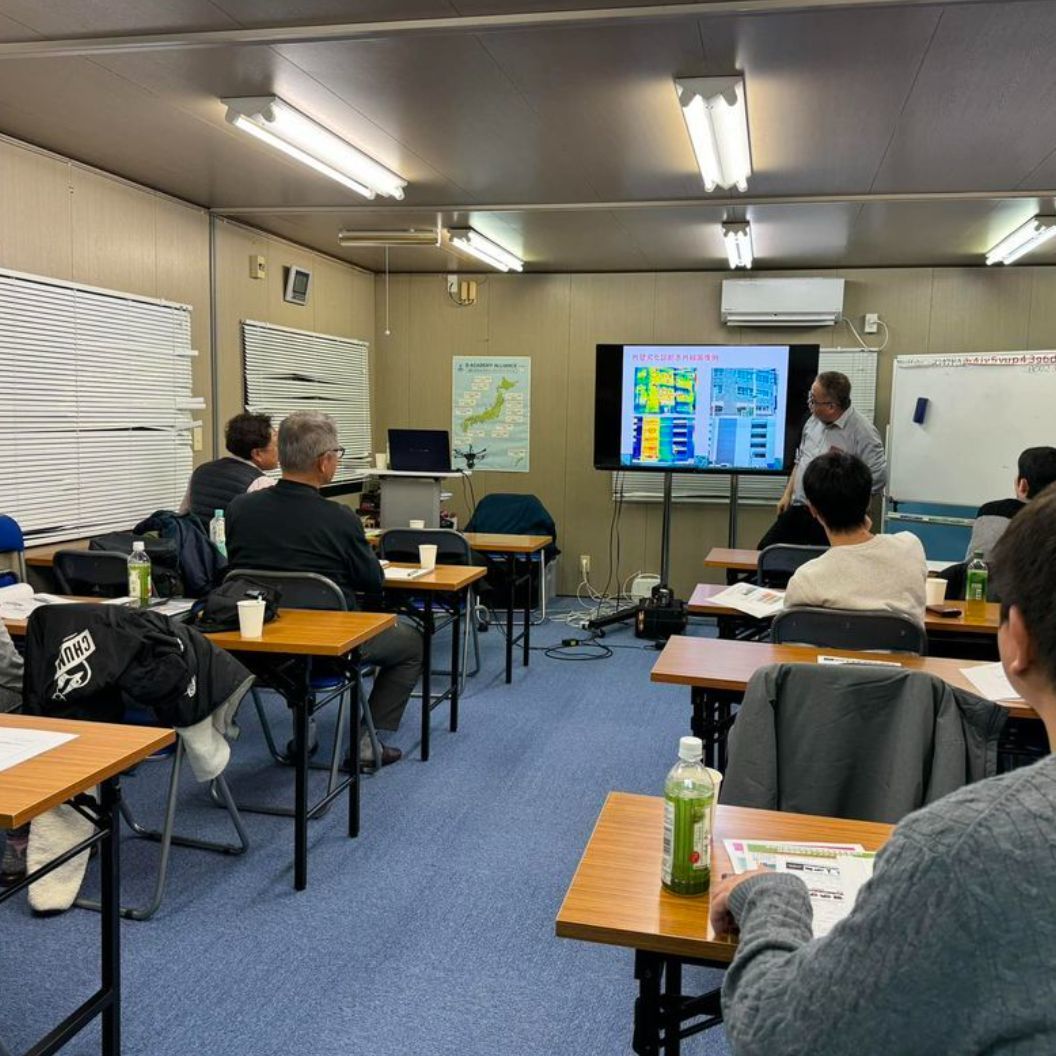 室内でのレクチャー・赤外線カメラ搭載ドローンによる事例紹介・データ解析について