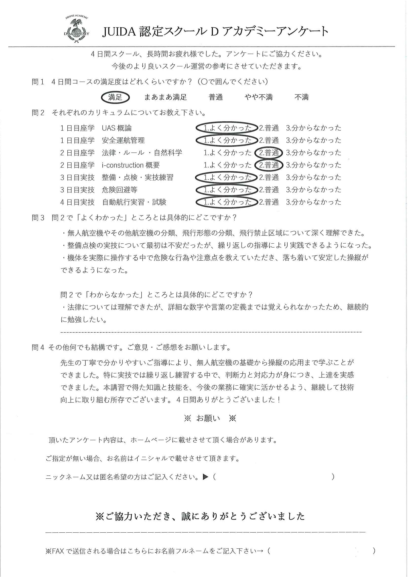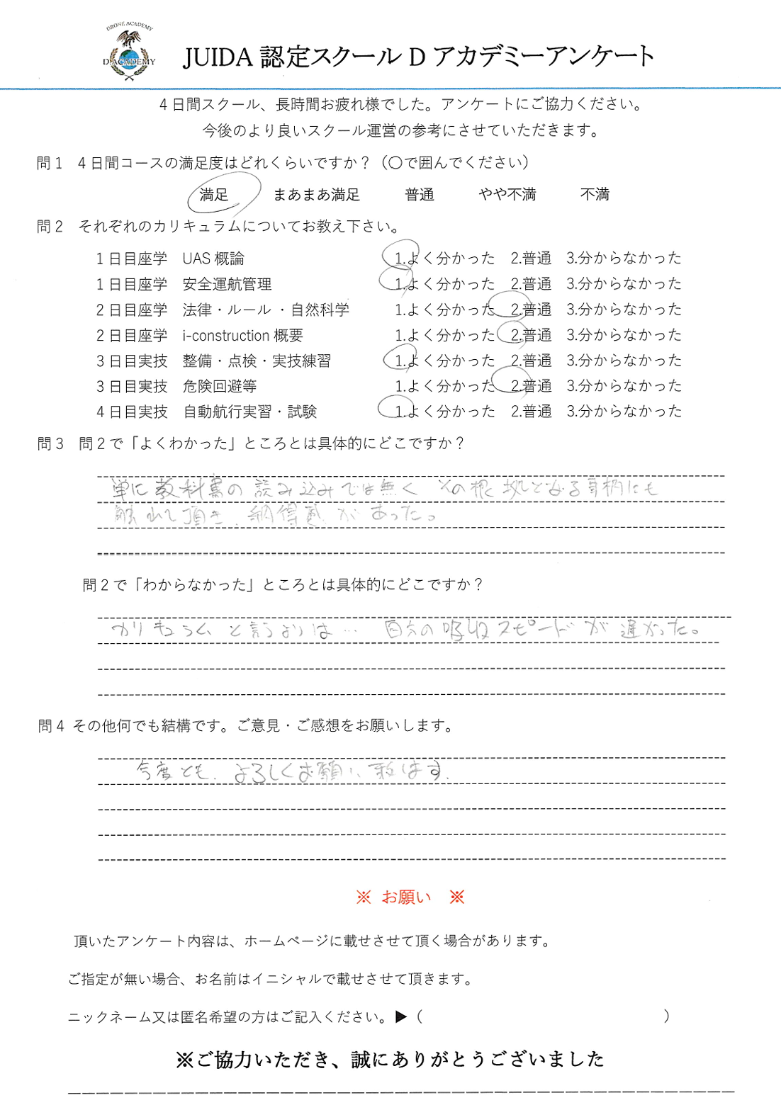 UAVを使った業務を始めて5ヵ月ですが、始めた当初に基本を行ったつもりでした。少し経験してから、改めて基本を復習でき、理解が深まったと思います。分からないところは気軽に質問することができたので良かった。雑談・・・・・ではなく、先生の経験、体験談が非常に楽しく勉強になりました。どんなに上手い方でも、100%はないとよくわかりました。