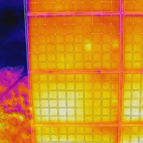これをドローン搭載した赤外線カメラで探します。しかし熱源は鳥の糞や雑草でもホットスポットのように見えますから必ず可視画像との比較チェックが必要です。ホットスポットができると、発電効率が下がり、最悪の場合は、パネルの故障にも繋がるため、点検作業を行うことは、太陽光発電所において大変重要なことです。