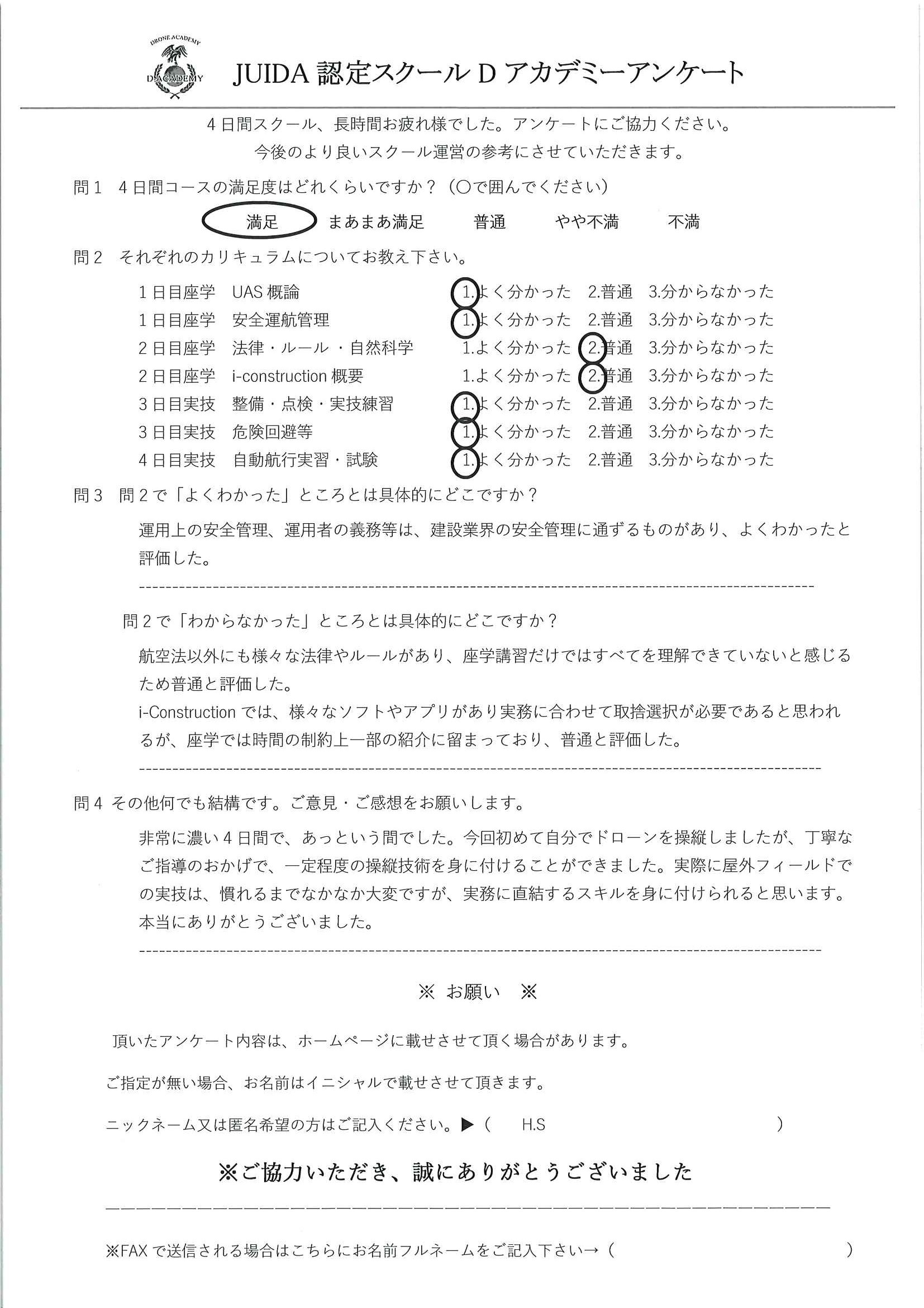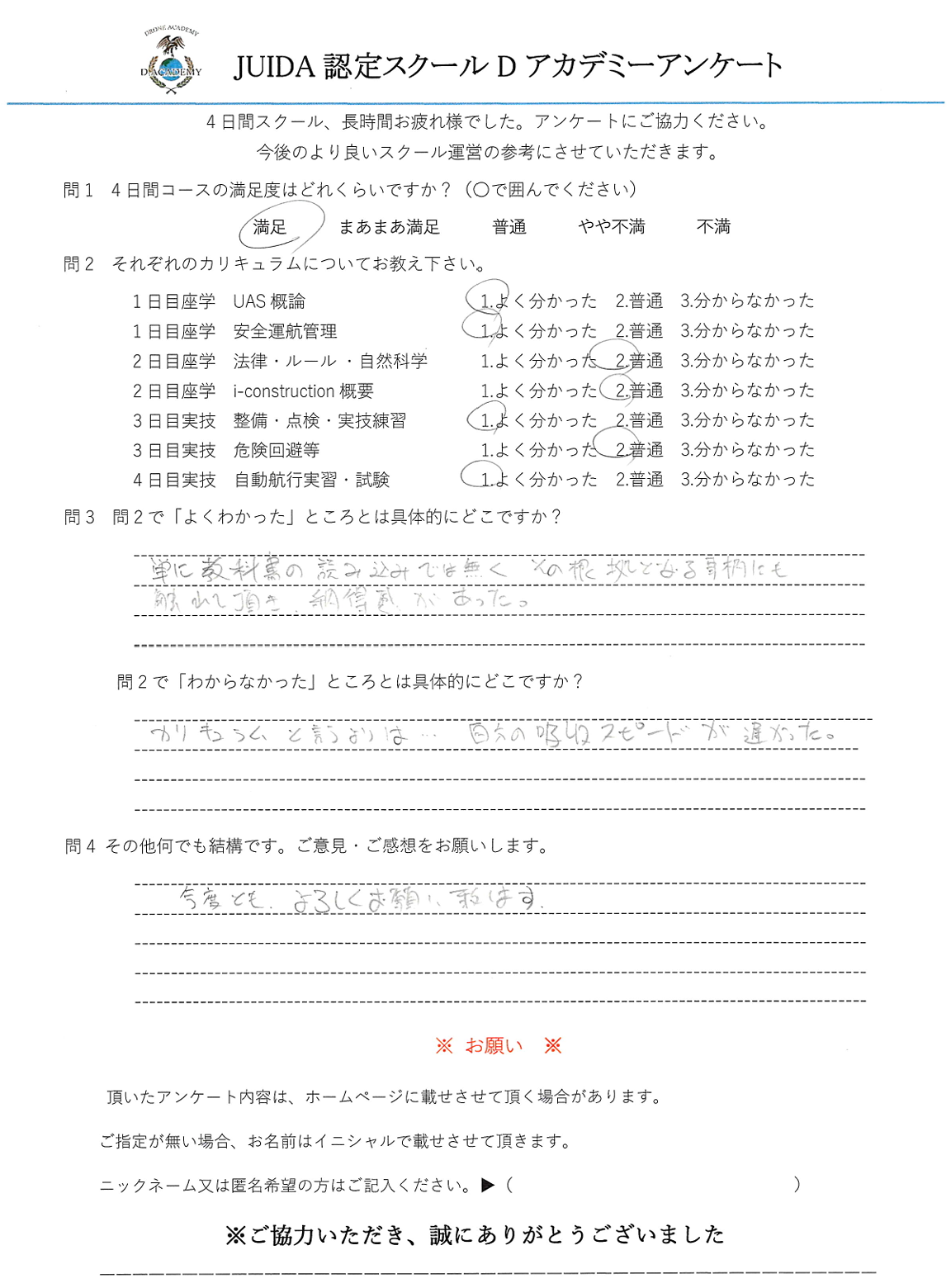 UAVを使った業務を始めて5ヵ月ですが、始めた当初に基本を行ったつもりでした。少し経験してから、改めて基本を復習でき、理解が深まったと思います。分からないところは気軽に質問することができたので良かった。雑談・・・・・ではなく、先生の経験、体験談が非常に楽しく勉強になりました。どんなに上手い方でも、100%はないとよくわかりました。
