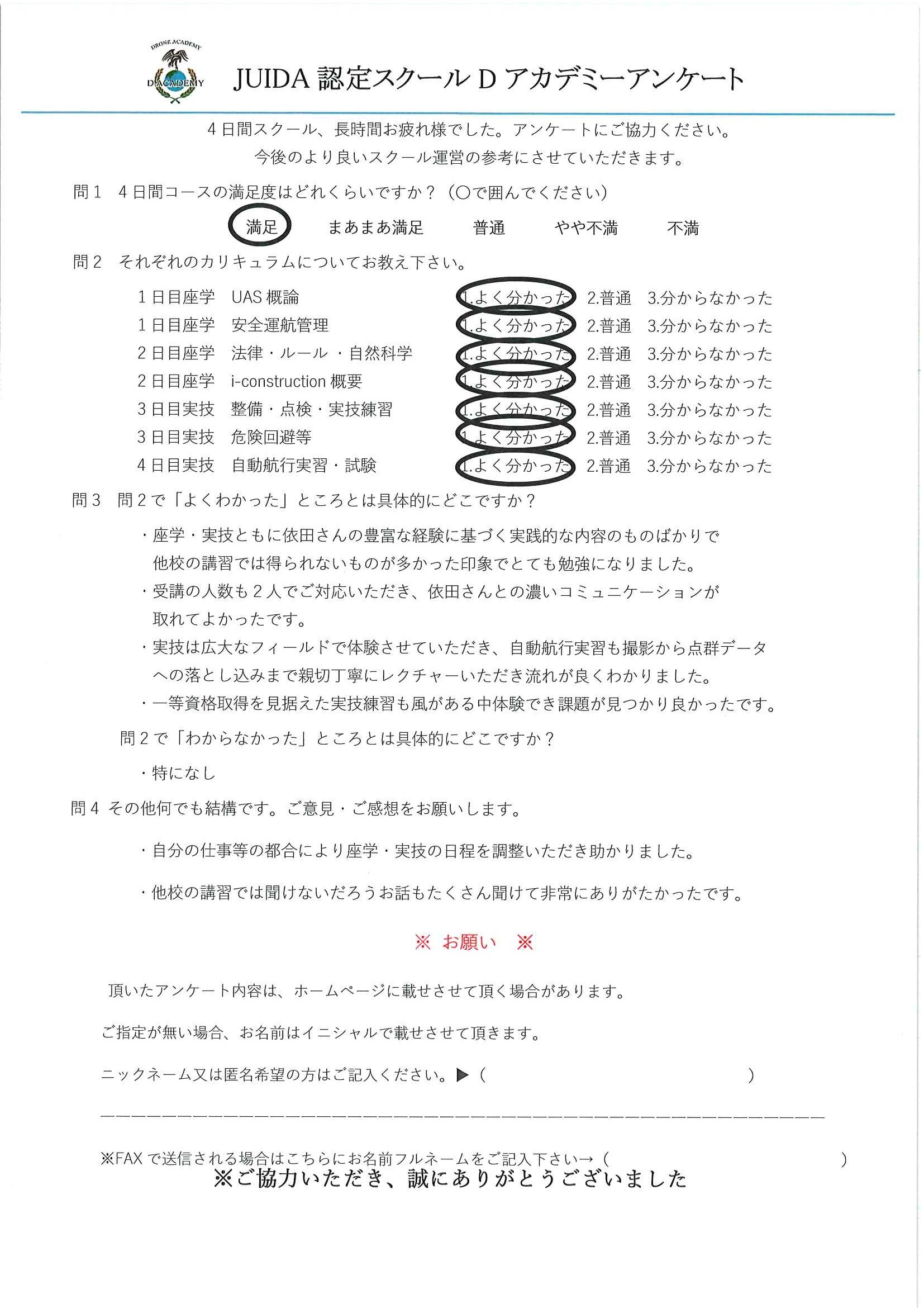 危険回避等実践できた事は大変良かったと思います。GS.PROの操作方法がよくわかりました。今回受講したことは、私にとっても会社の安全運行管理上でも大変に意義の有るものでした。実践に基づいた指導や、飛行するうえで技術向上や健康管理の大切さを学ぶことができました。